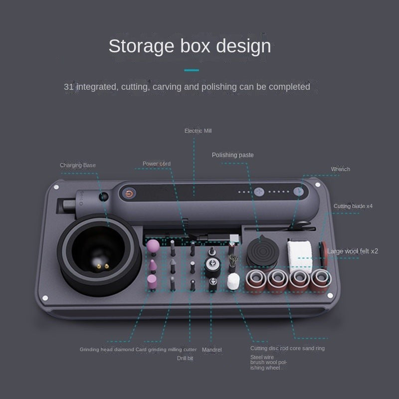 Rated power: 64W Voltage: 8V Range: polished iron plate for 12 minutes Maximum no-load speed: 28000r/min Product size: 37 * 37 * 200mm Battery: Lithium battery Gear adjustment: 5th gear Clamping range: 3.2mm Function: carving, drilling, polishing, polishing, cutting